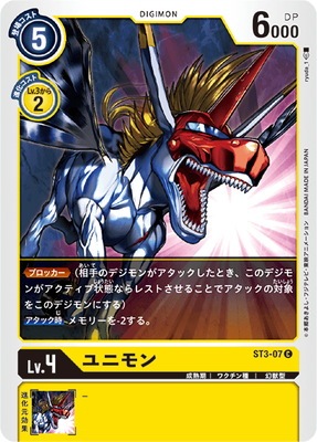 ≪ブロッカー≫(相手のデジモンがアタックしたとき、このデジモンがアクティブ状態ならレストさせることでアタックの対象をこのデジモンにする)【アタック時】メモリーを-2する。