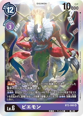 ≪道連れ≫(バトルでこのデジモンだけが消滅したとき、バトルした相手のデジモンを消滅させる)【登場時】自分のトラッシュから、紫のLv.4以下のデジモンカード2枚までをコストを支払わずに登場できる。この効果で登場したデジモンの【登場時】効果は発揮しない。