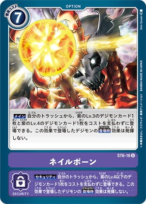 【セキュリティ】自分のトラッシュから、紫のLv.4以下のデジモンカード1枚をコストを支払わずに登場できる。この効果で登場したデジモンの【登場時】効果は発揮しない。