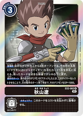 【登場時】自分のデッキの上から4枚オープンする。その中の名称に「ドラモン」か「ジャスティモン」を含むカード1枚を手札に加える。残ったカードは好きな順番でデッキの下に戻す。【自分のターン】黒の自分のデジモンがアタックしたとき、このテイマーをレストさせることで、次の相手のターン終了時まで、そのデジモンをDP+1000。