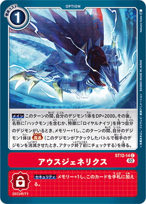 【メイン】このターンの間、自分のデジモン1体をDP+2000。その後、名称に「ハックモン」を含むか、特徴に「ロイヤルナイツ」を持つ自分のデジモンがいるとき、メモリー+1し、このターンの間、自分のデジモン1体は≪貫通≫(このデジモンがアタックしたバトルで相手のデジモンを消滅させたとき、アタック終了前にチェックする)を得る。