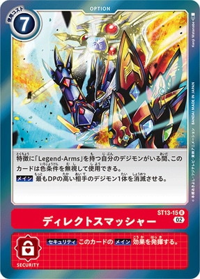 特徴に「Legend-Arms」を持つ自分のデジモンがいる間、このカードは色条件を無視して使用できる。【メイン】最もDPの高い相手のデジモン1体を消滅させる。