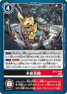 【セキュリティ】自分の手札から、特徴に「Legend-Arms」を持つ登場コスト7以下のデジモンカード1枚をコストを支払わずに登場できる。その後、このカードをバトルエリアに置く。
