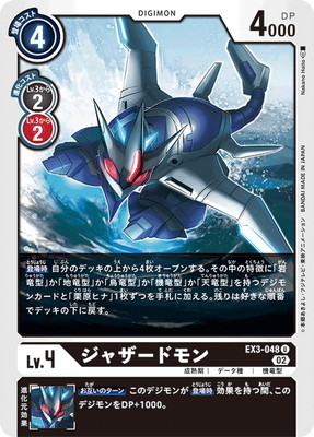 【登場時】自分のデッキの上から4枚オープンする。その中の特徴に「岩竜型」か「地竜型」か「鳥竜型」か「機竜型」か「天竜型」を持つデジモンカードと「栗原ヒナ」1枚ずつを手札に加える。残りは好きな順番でデッキの下に戻す。