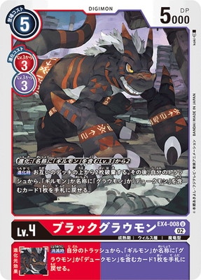 【消滅時】自分のトラッシュから、「ギルモン」か名称に「グラウモン」か「デュークモン」を含むカード1枚を手札に戻せる。