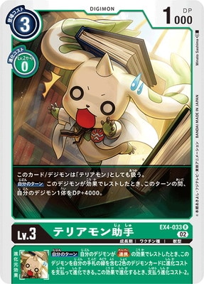 【自分のターン】自分のデジモンが≪連携≫の効果でレストしたとき、このデジモンを自分の手札の緑を含む2色のデジモンカードに進化コストを支払って進化できる。この効果で進化するとき、支払う進化コスト-2。
