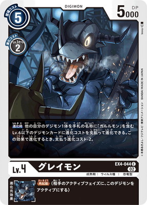 【進化時】他の自分のデジモン1体を手札の名称に「ガルルモン」を含むLv.6以下のデジモンカードに進化コストを支払って進化できる。この効果で進化するとき、支払う進化コスト-2。