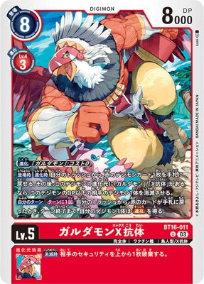 【登場時】【進化時】自分のトラッシュから、赤のデジモンカード1枚を手札に戻せる。その後、このデジモンの進化元に「ガルダモン」/「X抗体」があるなら、このデジモンのDP以下の相手のデジモン1体を消滅させる。