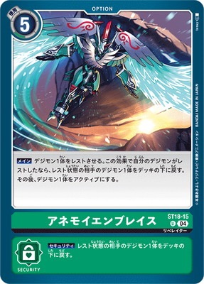 【メイン】デジモン1体をレストさせる。この効果で自分のデジモンがレストしたなら、レスト状態の相手のデジモン1体をデッキの下に戻す。その後、デジモン1体をアクティブにする。